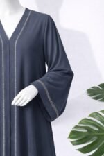 Crafted from premium lightweight fabric, this abaya offers a smooth flow and breathable comfort throughout the day. The V-neckline adds subtle elegance while maintaining modesty, and the loose-cut sleeves ensure ease of movement. Its full-length silhouette provides complete coverage without compromising on style. Whether worn for work, gatherings, or special events, the Silent Line Abaya delivers effortless grace and comfort.